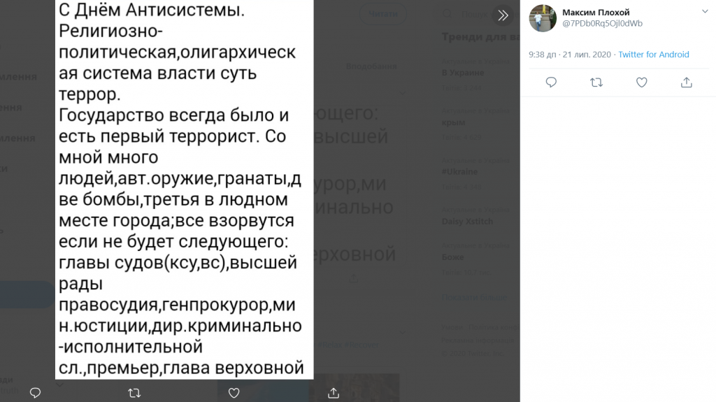 Зловмисник привітав усіх з днем антисистеми і заявив, що «держава – це перший терорист».