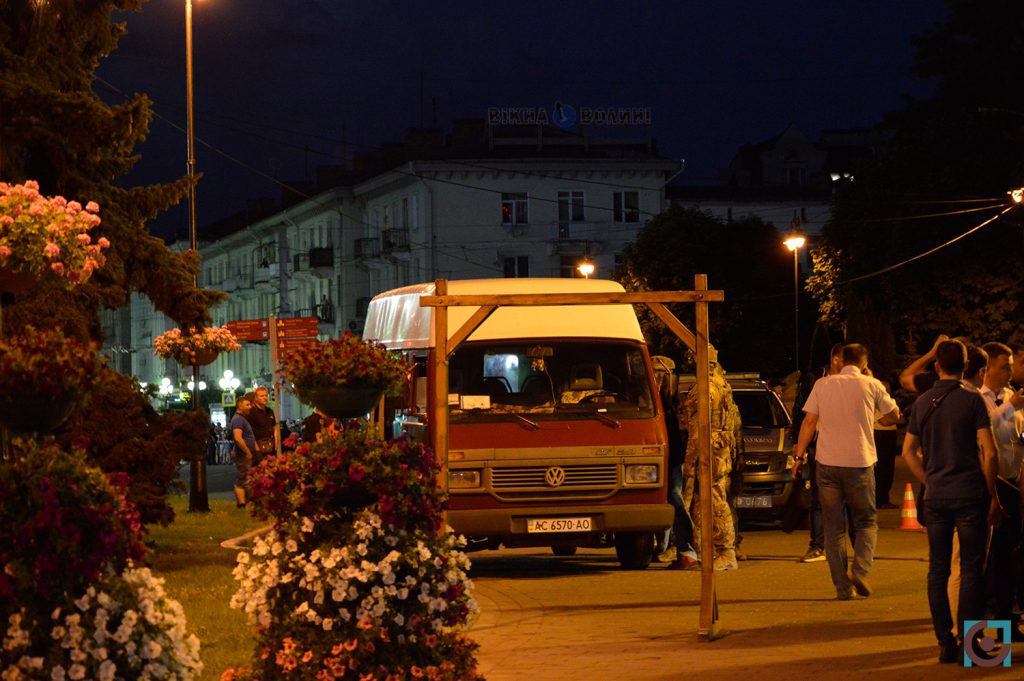 Згодом на Театральному майдані, у самому центрі Луцька, з’явився рейсовий автобус «Берестечко-Краснилівка». Через деякий час до нього під’їхало авто поліцейських, але в цей момент пролунав постріл. Театральний майдан оточили правоохоронці і відмежували місце події стрічкою. Стягується важка техніка, працюють спецслужби. Поліція оголосила оперативний план «Заручник», а СБУ – «Бумеранг».