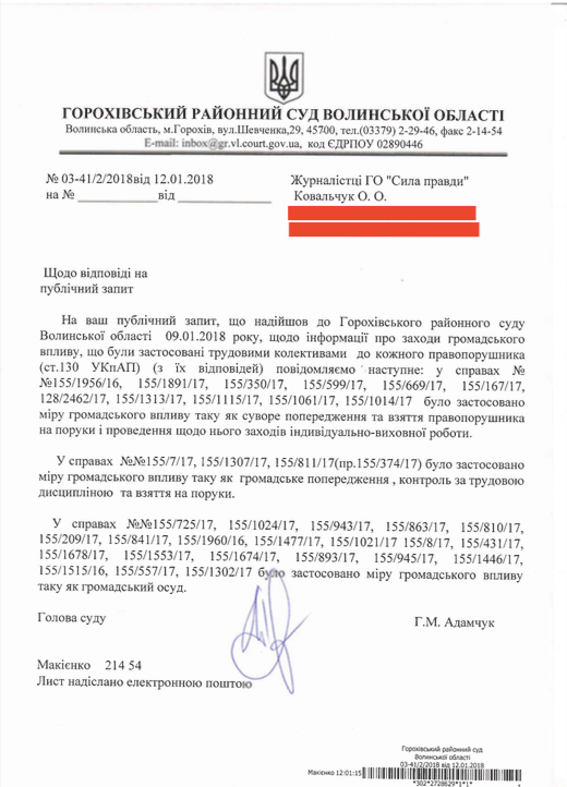 Оскільки суд передав право трудовим колективам застосувати до порушників заходи громадського впливу і зобов’язав проінформувати про них в 10 денний термін, то ми надіслали на ім’я голови суду відповідний запит. Горохівський районний суд відповів відверто. До більшості з порушників застосували міру покарання «громадський осуд».