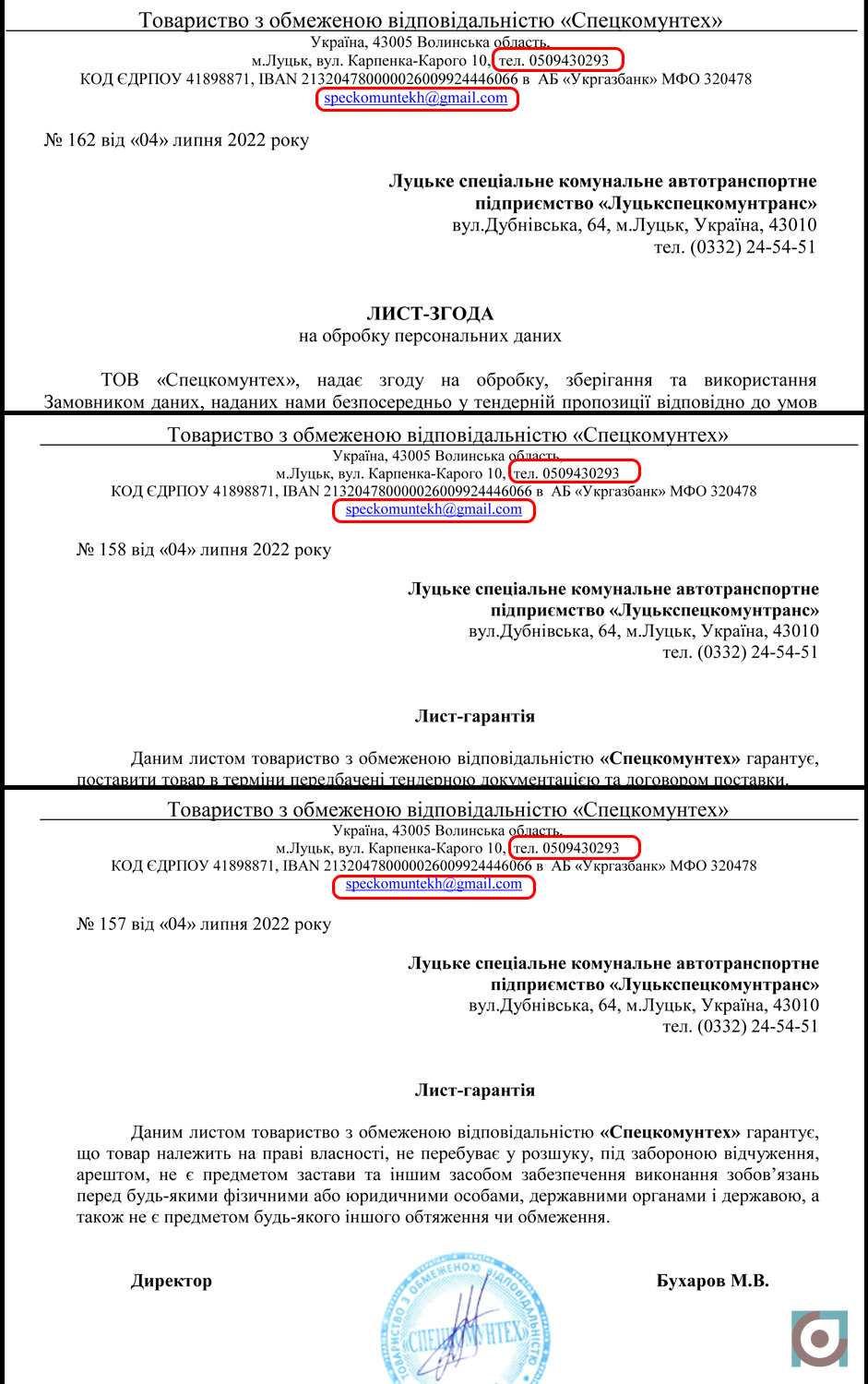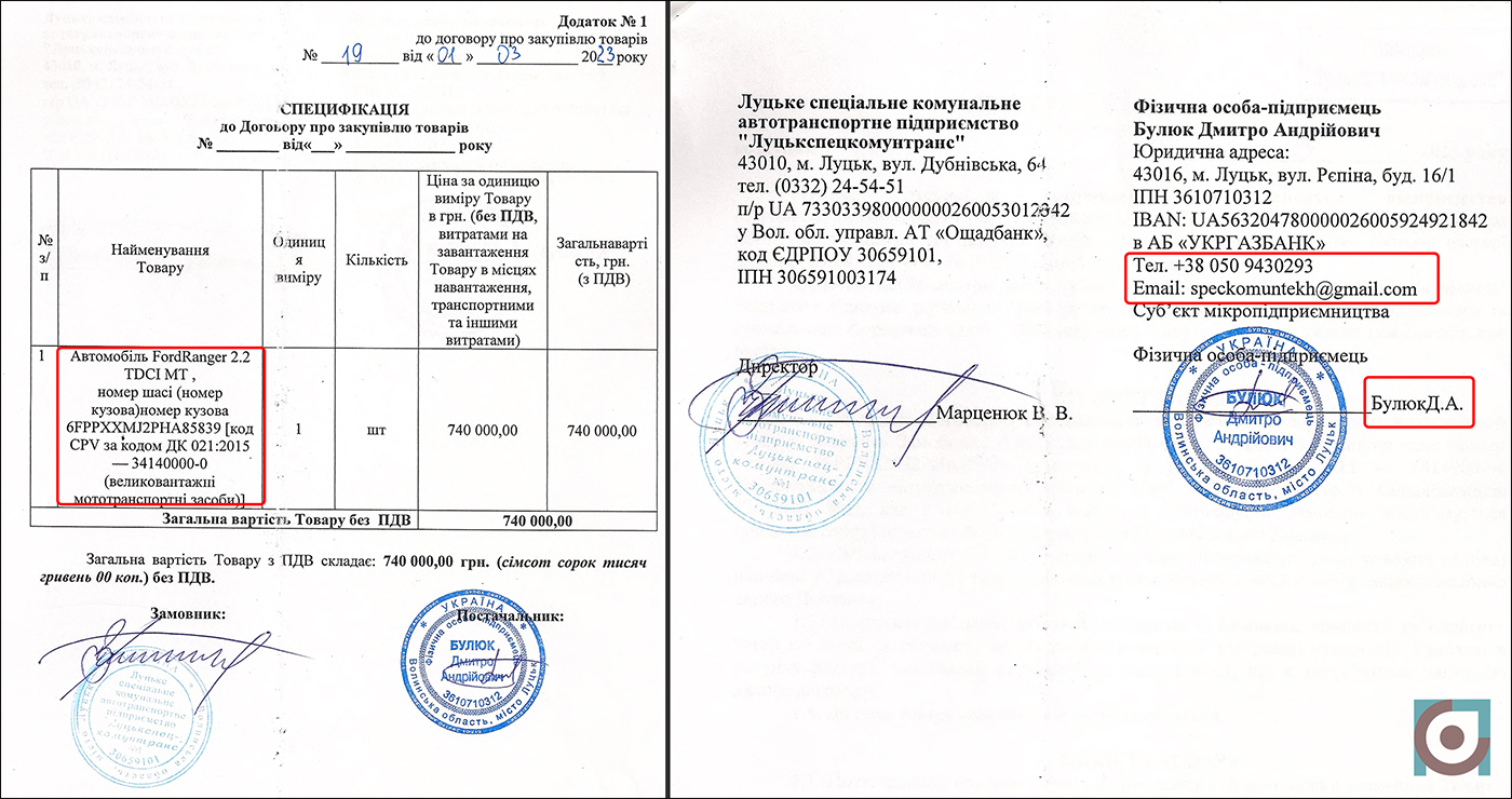 Вперше на думку про пов’язаність Булюка та «Спецкомунтеху» наштовхнула інша закупівля комунальників. Навесні 2023-го «Луцькспецкомунтранс» придбав у нього вживаний пікап «Ford Ranger». Комунальники уклали з Дмитром Булюком прямий договір, «Спецкомунтех» нібито жодного відношення до цієї закупівлі не мав. Тим не менше, у договорі покупця з підприємцем контактною електронною поштою останнього вказана [email protected] – офіційна пошта ТОВ «Спецкомунтех», а телефон – контактний номер директора ТОВ «Спецкомунтех» Михайла Бухарова.