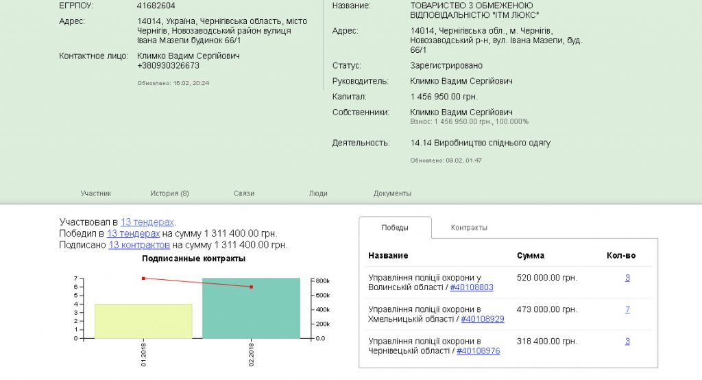 Всі три договори на закупівлю одягу Управління поліції охорони укладає із ТзОВ «ІТМ Люкс», що зареєстроване у Чернігівській області. Підприємство зареєстроване у жовтні 2017 року і основним видом його діяльності є виробництво спіднього одягу. Його засновником та керівником є Климко Вадим Сергійович, який також є і засновником ТОВ «Швейне підприємство «Козак».