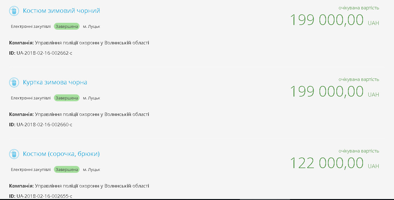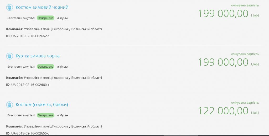 У першій закупівлі Управління поліції охорони у Волинській області купляє «костюм зимовий чорний» в кількості 85 штук за ціною – 199 000 гривень.