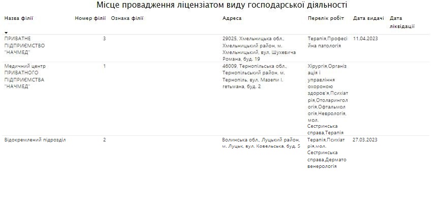 Ліцензію на провадження господарської діяльності з медичної практики від Міністерства охорони здоров’я головний офіс приватного підприємства «Начмед» отримав у грудні 2022 року. Згідно з цим документом, центр має право надавати послуги у сфері неврології, організації та управлінні охороною здоров’я, отоларингології, офтальмології, психіатрії, терапії, хірургії. Втім, у підприємства всього зареєстровано 11 філій, а згідно ліцензійного реєстру МОЗ, лише два підрозділи мають відповідні ліцензії – у Луцьку (терапія, психіатрія, сестринська справа, дерматовенерологія) та Хмельницькому (терапія та професійна патологія). Чи є відповідний дозвіл у ще восьми філій медичного центру, наразі невідомо.