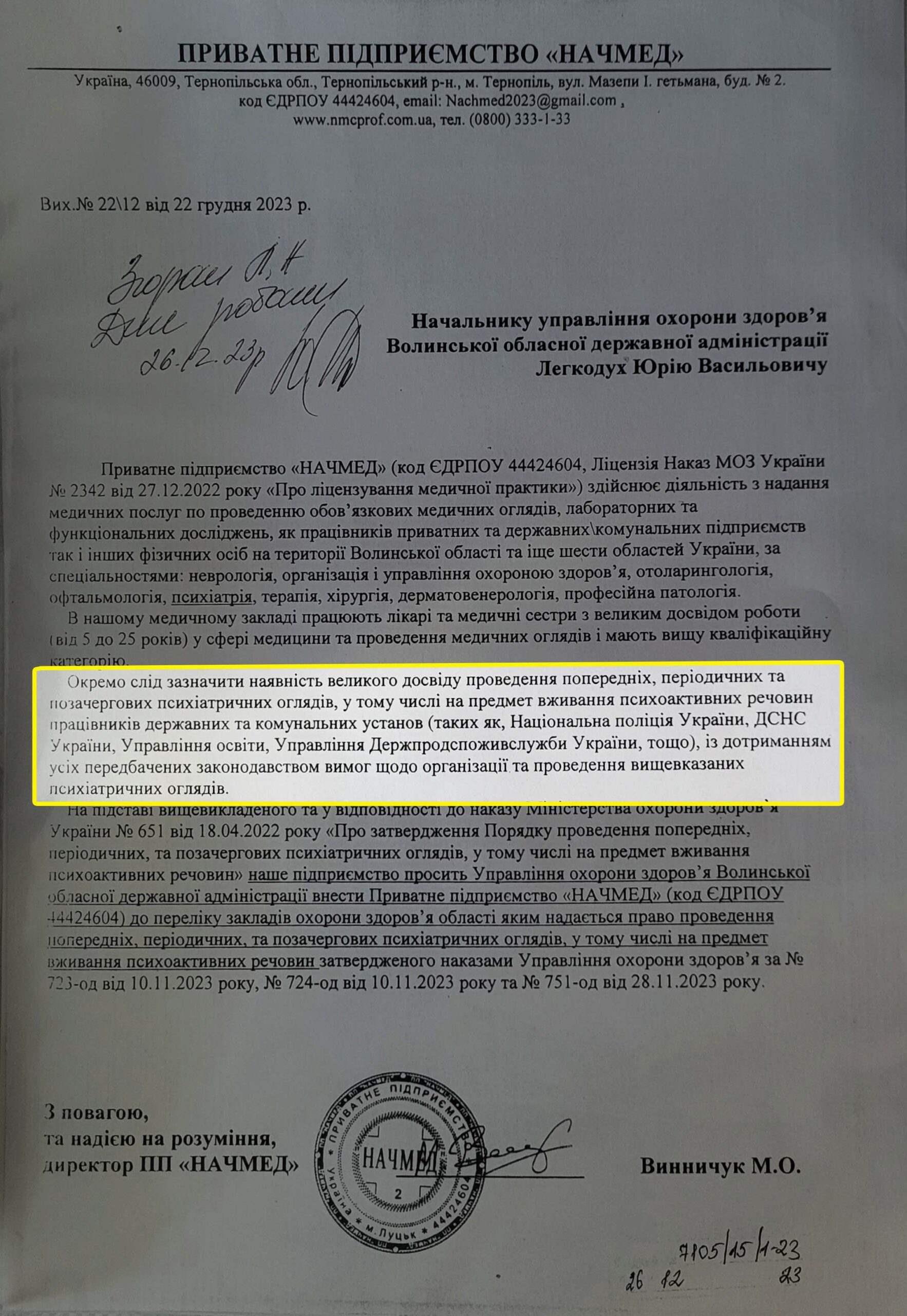 Однак, за словами заступниці начальника управління охорони здоров’я Людмили Рожко, у грудні 2023-го медцентр звертався до них з проханням внести волинську філію до офіційного переліку закладів, що мають право на проведення психіатричних оглядів і видачі форми 100-2/о. Втім дозволу на її оформлення підприємство так і не отримало.