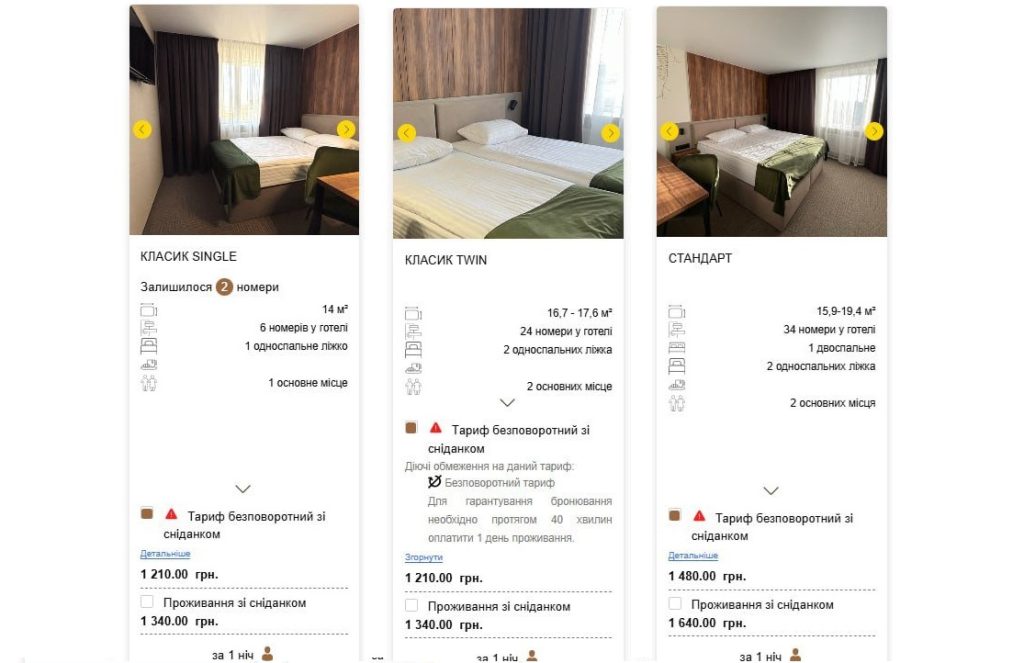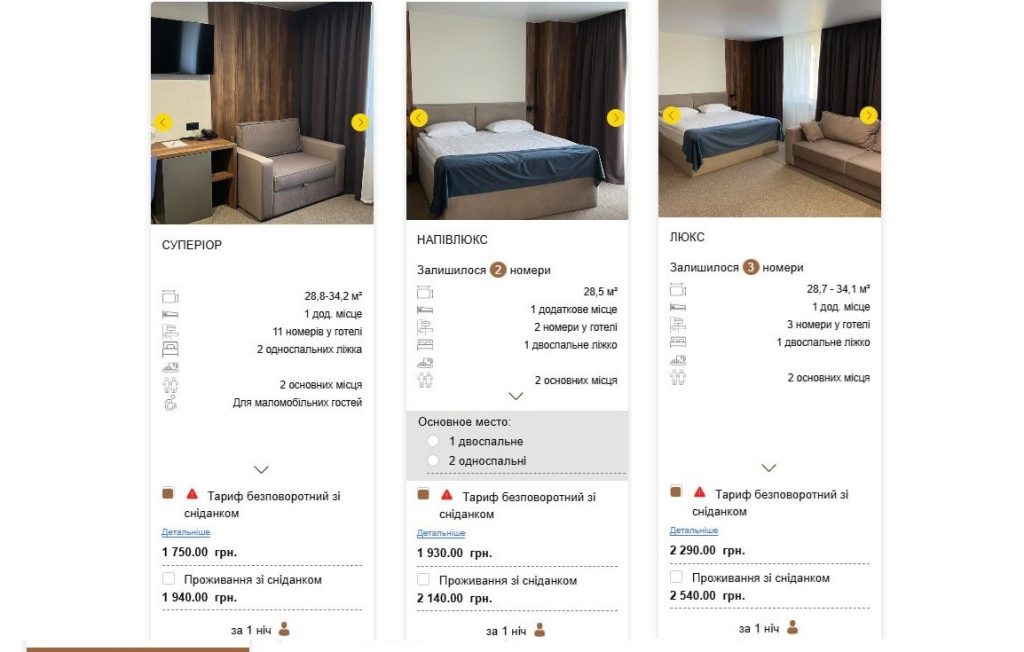 Ціни за номер стартують від 1340 гривень за добу. За умови повної попередньої оплати, яка не повертається, – від 1210 гривень.