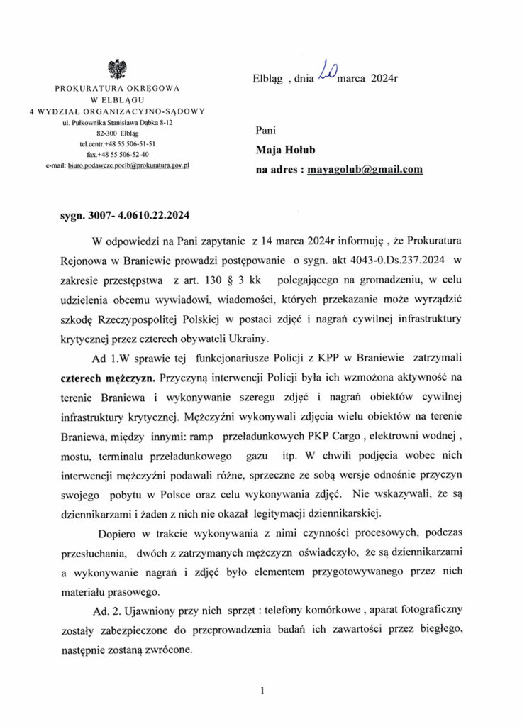 «На момент підходу до них чоловіки подавали різні, суперечливі з собою версії щодо причин свого перебування в Польщі чи цілей фотографування. Не вказали, що є журналістами і жоден з них не показав журналістське посвідчення. Тільки під час виконання з ними процесуальних правил, під час прослуховування, двоє з затриманих чоловіків заявили, що є журналістами, а знімати фото та відео – це було елементом приготованого ними журналістського матеріалу. Виявлену при них техніку: мобільні телефони, фотоапарат, вилучили для проведення експертизи їх вмісту фахівцем, після цього їх повернуть», — відповіли у польській прокуратурі.
