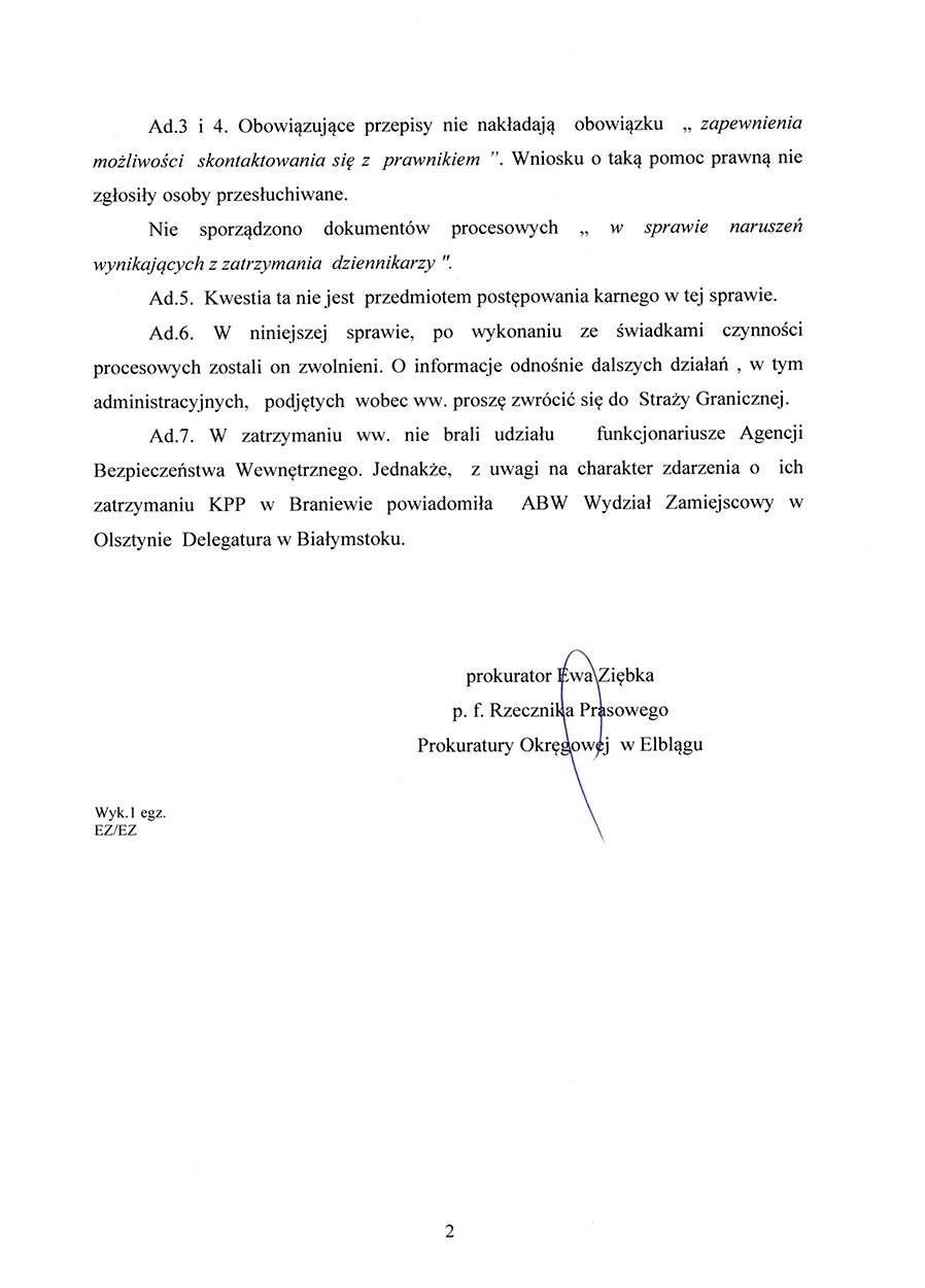 Також у листі з прокуратури зазначили, що журналісти не заявляли про розмову з адвокатом чи юристом. Представники Внутрішньої служби безпеки (Agencja Bezpieczeństwa Wewnętrznego, ABW) не брали участі в затриманні чоловіків. Однак, зважаючи на характер випадку, з КПП в Бранево повідомили працівників одного з відділів спецслужби про це.