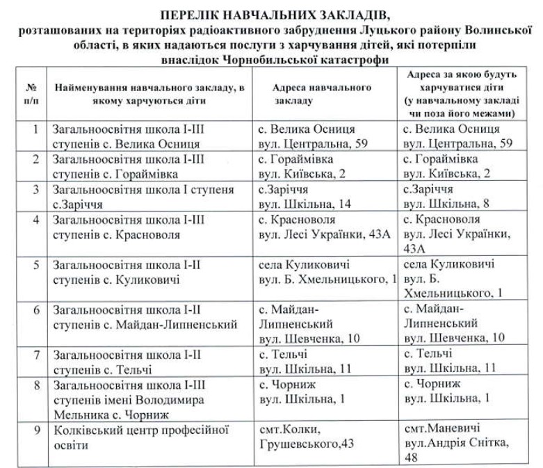 Школярів, які мають статус постраждалих від аварії на ЧАЕС, з Камінь-Каширського та Луцького районів до кінця 2025 року харчуватимуть як дітей особливої категорії, однак за новими правилами. На обіди для них виділили майже 70 мільйонів гривень. Готуватиме столична фірма «Рамедас Україна», яка надавала ці послуги і минулоріч. Однак цього навчального року харчування таких учнів уперше за багато років організували за звичайними нормами, затвердженими для середньостатистичного школяра.