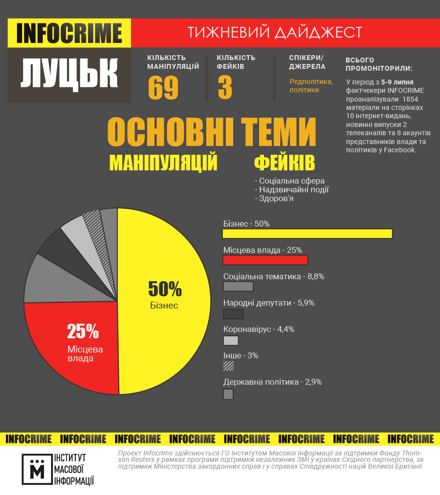 Такі дані отримали в результаті щотижневого моніторингу інформаційного простору командою проєкту Infocrime Lutsk за підтримки британського фонду Thompson Reuters, у партнерстві з Інститутом масової інформації.