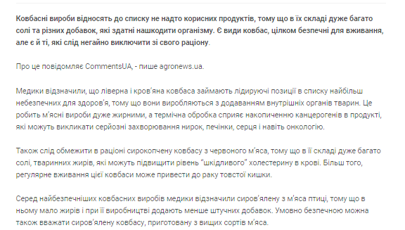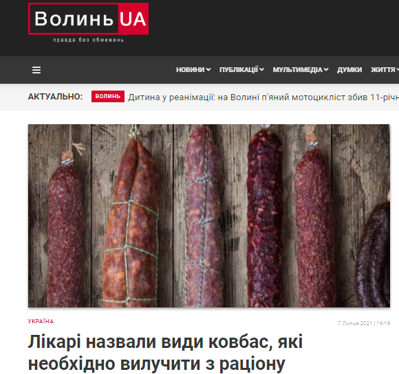 Про умовно безпечну і «небезпечну» ковбаcу з’явилась інформація на сайті «ВолиньUA» зі згадкою про те, які ковбаси лікарі не радять вживати. Однак у новині лікарів не згадали. На сайті «ВолиньUA» одразу привернув увагу заголовок «Лікарі назвали види ковбас, які необхідно вилучити з раціону». У матеріалі є неактивні посилання. Якщо ж погуглити, то першоджерелом є особистий блог автора Артура Федорова на «Медикфорумі». Цікаво, що у опублікованому тексті взагалі немає посилань на конкретний висновок, який зробила група медиків в рамках якогось дослідження.