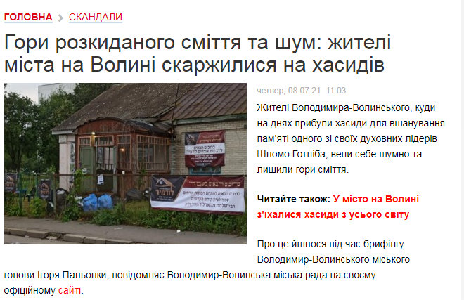 На сайті «Під прицілом» є новина із мовою ворожнечі та з маніпулятивним узагальненням. У назві «Гори розкиданого сміття та шум: жителі міста на Волині скаржилися на хасидів» є перебільшення, щоб викликати певні емоції у читачів. У новині писали про приїзд хасидів до Володимира-Волинського, куди вони приїздили помолитися. Текст новини не супроводжується фото, де було б видно «гори» сміття, про які йшлося у заголовку. На сайті є лише головне фото, де видно пакети зі зібраним сміттям. Однак автор цього фото не вказаний.
