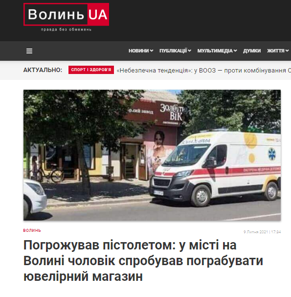 Наприклад, на сайті «ВолиньUA» написали новину «Погрожував пістолетом: у місті на Волині чоловік спробував пограбувати ювелірний магазин», посилаючись на один з телеграм-каналів. Проте ця інформація виявилась фейковою. Офіційних коментарів медиків і поліції ніхто не брав, щоб дізнатися про цю ситуацію детальніше.