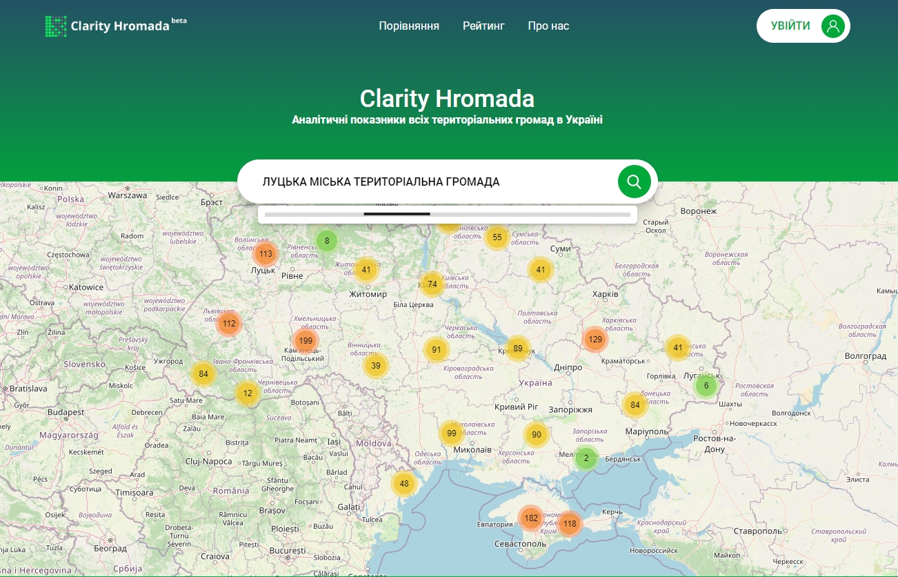 Розробники аналітичної платформи Clarity Project запустили новий сервіс – Clarity Hromada. Ця платформа дозволяє побачити ключові показники територіальних громад: бюджетні витрати, економічну активність, демографію, відбудову тощо.