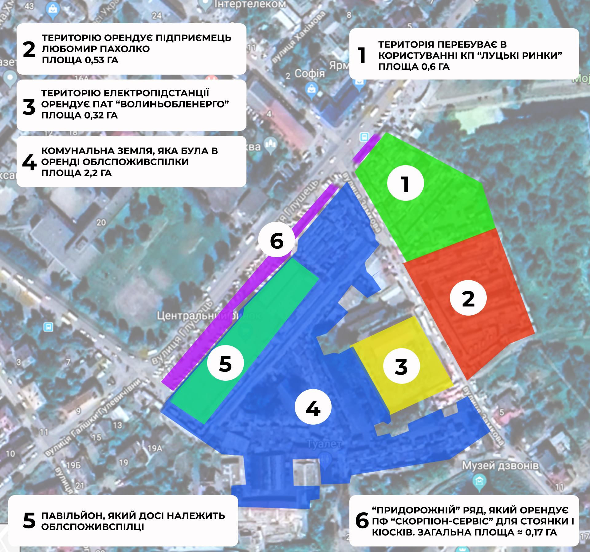 Згадана ділянка площею 2,2 гектара – найбільша на ринку. Тому щоб говорити про якісь комплексні рішення міська влада намагається отримати контроль над нею. Також 0,6 гектара вже контролює КП «Луцькі ринки», ще 0,5 гектара орендує Любомир Пахолко, який є співвласником «Нового ринку». Цікаво, що у 2018 році до Пахолка були претензії через те, що підприємець орендував цю частину ринку як парковку, проте там фактично здавали в оренду торгові місця. Нині ж частину території таки виділили під стоянку