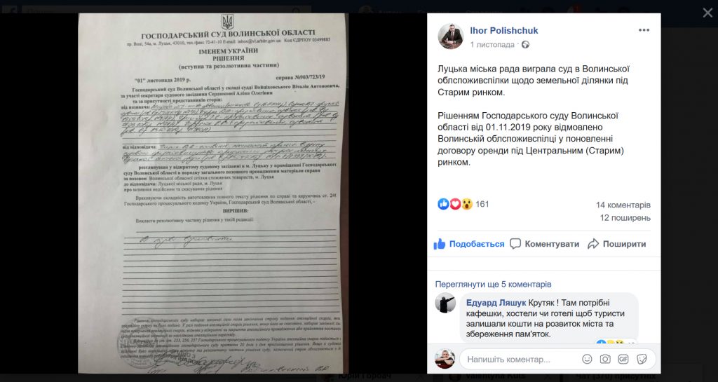 Першого листопада Господарський суд Волинської області відмовив облспоживспілці у поновленні договору оренди під Старим ринком. Про це на своїй сторінці у Фейсбуці написав Ігор Поліщук.