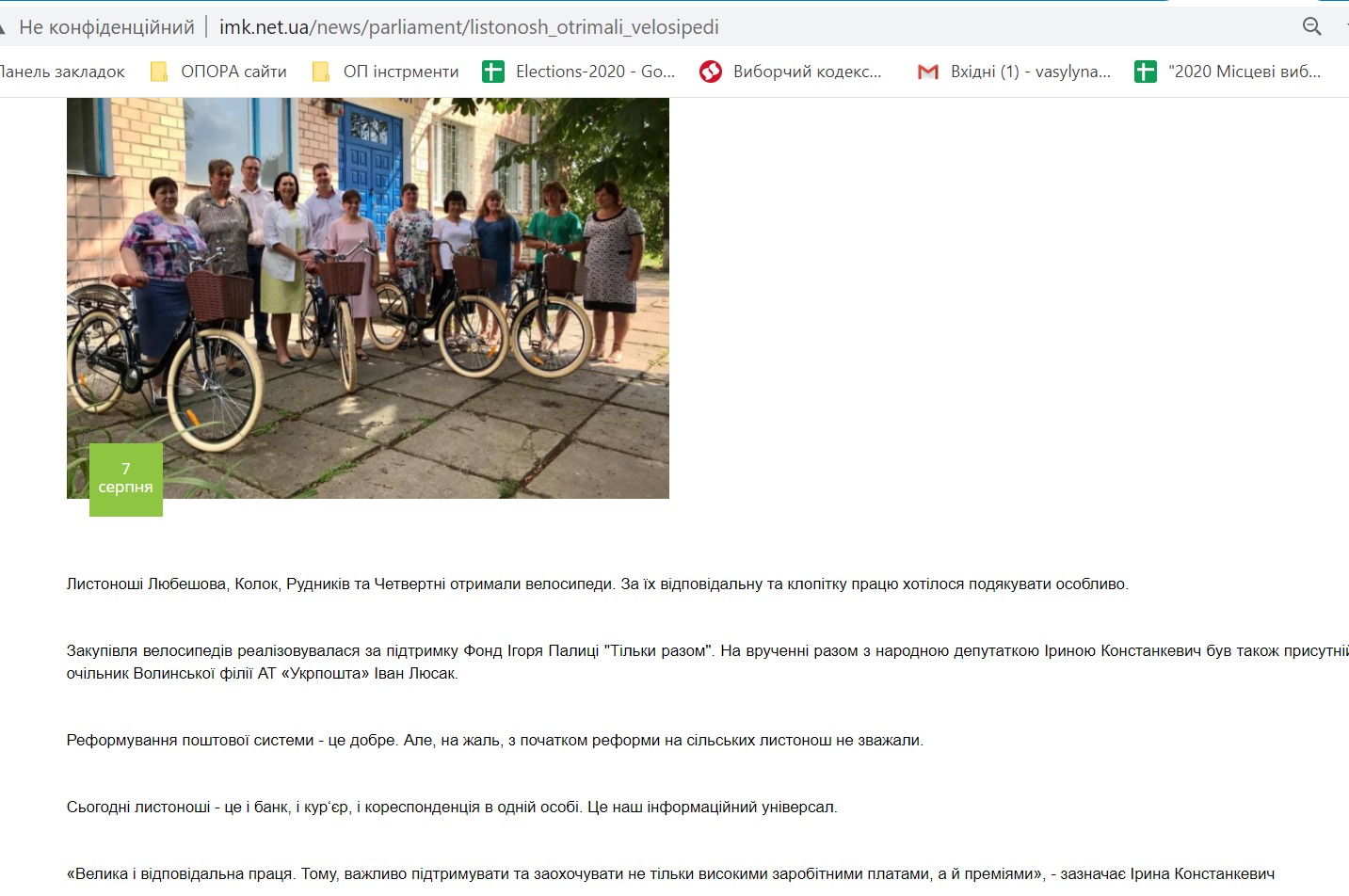 7 серпня на сайті народної депутатки України Ірини Констенкевич опубліковано матеріал про те, що від фонду листоноші у виборчому окрузі №23 отримали велосипеди. Аналогічний матеріал 10 серпня з’явився на сайті фонду. У ньому зазначено, що передала велосипеди народна депутатка України Ірина Констанкевич.