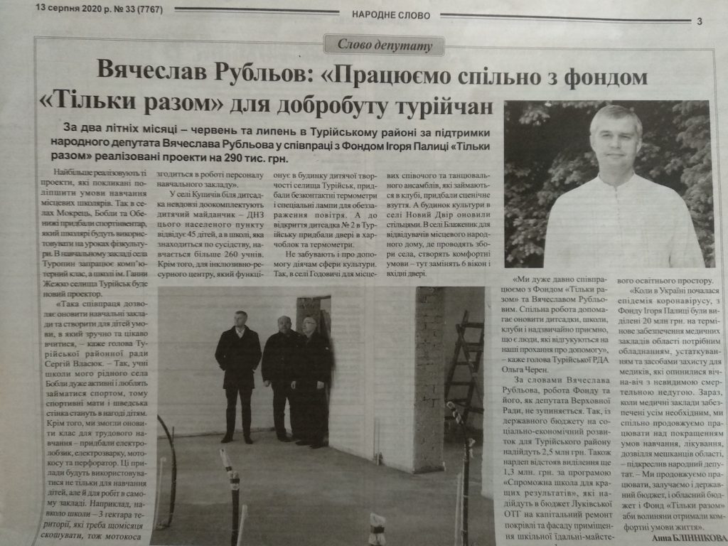 Також 13 серпня у Турійській районній газеті «Народне слово» вийшла публікація «Вячеслав Рубльов: «Працюємо спільно з фондом «Тільки разом» для добробуту турійчан». У ній розповідають про проєкти, реалізовані спільно депутатом і фондом, які були втілені у червні та липні. Йдеться загалом про 290 тис. грн. Кошти спрямовували для придбання спортінвентарю у школах сіл Мокрець, Бобли та Обенижі, інвентарю для комп’ютерного класу школи села Туропин та проектора для однієї зі шкіл Турійська. Також у публікації зазначають, що придбали одяг для художнього колективу села Годовичі та оновили стільці будинку культури у селі Новий двір. Розповідається у матеріалі й про плани – залучення коштів фонду для доукомплектування дитячого майданчика села Купичі та ремонту клубу у селі Блаженик.
