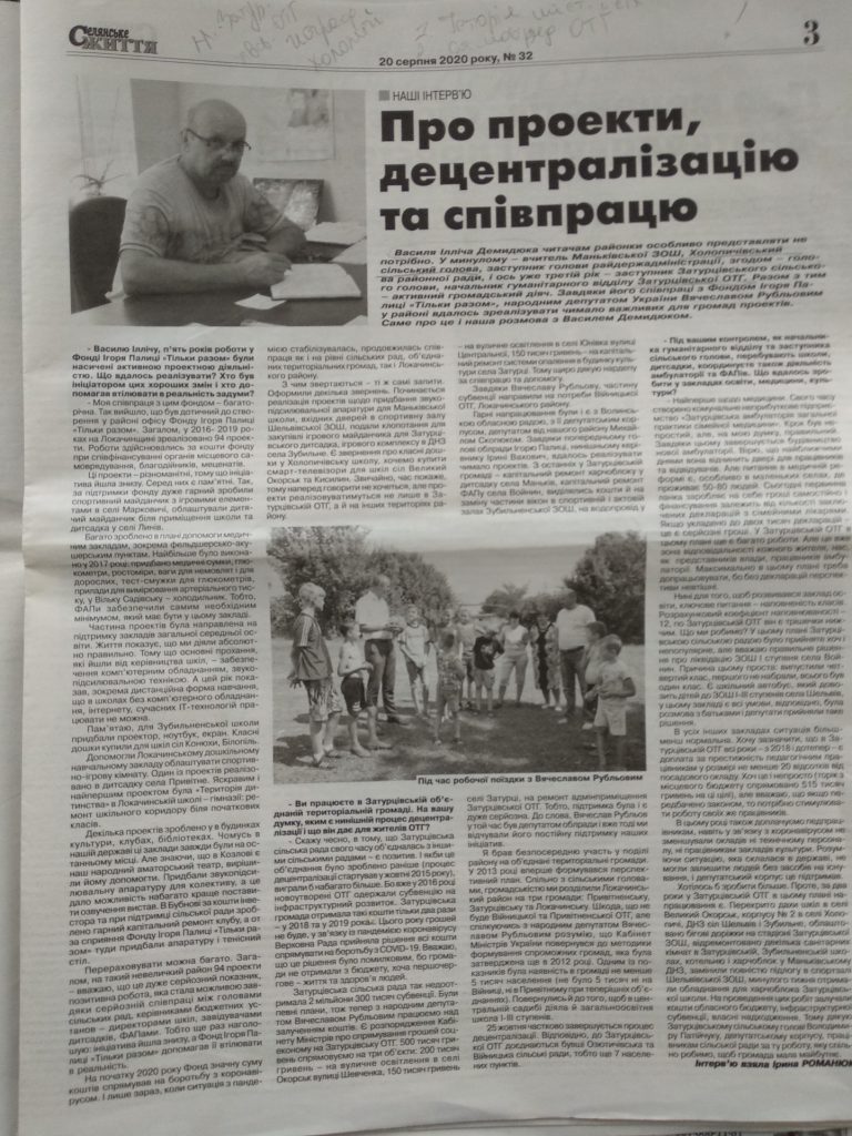 20 серпня у Локачинській районній газеті «Селянське життя» у рубриці «інтерв’ю» опублікували матеріал «Про проекти, децентралізацію та співпрацю». Йдеться про інтерв’ю із Василем Демидюком, котрий є заступником Затурцівського сільського голови. У більшості розмова стосується співпраці громади із нардепом Вячеславом Рубльовим та Фондом Ігоря Палиці «Тільки разом». Василь Демидюк розповідає про низку проектів на яких залучали кошти фонду протягом останніх п’яти років – придбання засобів для фельшерсько-акушерських пунктів, шкіл, будинків культури, бібліотек. Загалом зазначається, що мова йде про 94 об’єкти у районі. Також є згадка про залучення кошів на боротьбу із коронавірусною пандемією. До того ж, інтерв’юер озвучує, із якими запитами продовжують звертатися до фонду.