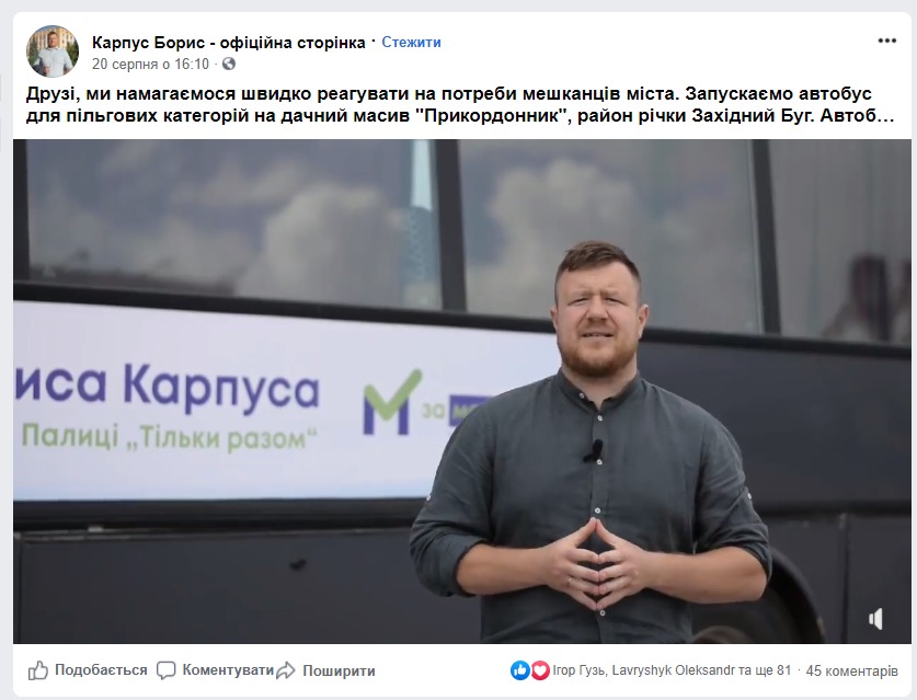 20 серпня на сторінці потенційного кандидата на посаду Нововолинського міського голови від партії «За майбутнє» Бориса Карпуса з’явилося повідомлення про ініціативу з автобусом. Зокрема, зазначається, що потенційний кандидат спільно з фондом Ігоря Палиці «Тільки разом» та командою «За майбутнє» у місті запустили пільговий автобус для незахищених категорій населення, обклеєний логотипами партії «За майбутнє» та БФ Ігоря Палиці «Тільки разом». Скористатися автобусом можуть усі охочі, хто має дачу на Бузі або біля 9-ої шахти. Курсуватиме транспорт у вівторок, п’ятницю, суботу та неділю. Про цю ініціативу написало 20 серпня інтернет-видання «Нововолинський інформаційний портал».