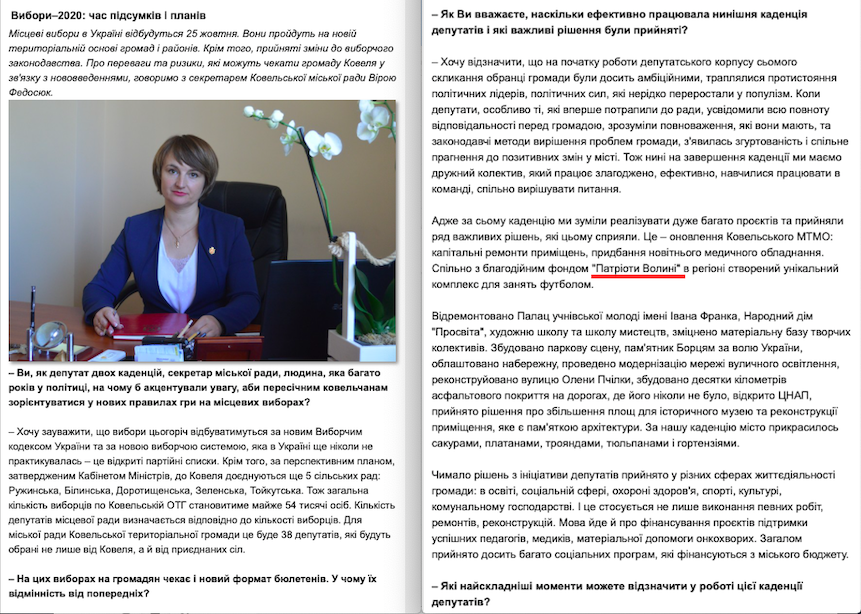 Про інший благодійний фонд – «Патріоти Волині», засновником якого є чинний народний депутат Степан Івахів та потенційний кандидат до Волинської обласної ради від партії «За майбутнє», згадувала секретар Ковельської міської ради та потенційна кандидатка у депутати Віра Федосюк. У розміщеному на сайті міської ради інтерв’ю, вона згадує, що завдяки співпраці з фондом у місті було побудовано унікальний комплекс для занять футболом.