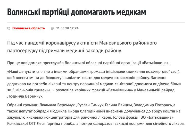Ще один натяк на «благодійність» було виявлено 12 серпня на сайті Волинської обласної організації ВО «Батьківщина». У дописі йдеться, що депутати Маневицької районної ради – представники партії ВО «Батьківщина» Людмила Веремчук, Руслан Тимчук, Галина Байцим, Володимир Поторась спільно з депутатом обласної ради Людмилою Кирдою благодійними внесками долучилися до збору коштів на закупівлю кисневих концентраторів для районної лікарні, а голова фракції ВО «Батьківщина» у Колківській ОТГ Леся Гарміда придбала чотири одноразові захисні костюми для сімейного лікаря. Окрім того, 26 серпня тут розмістили новину про те, що представники Володимир-Волинської районної організації ВО «Батьківщина» допомогли організувати художній благодійний пленер.