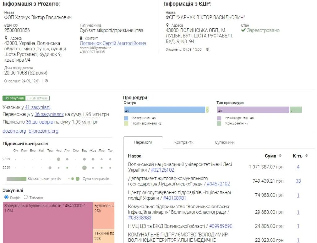 Активісти громадської ініціативи «За чесний тендер» вирішили перевірити, як витрачаються ці кошти і чи немає там зловживань. З Prozorro бачимо, що у 2020 році університет на різні ремонти уклав 10 договорів на загальну суму 3,3 мільйона гривень. За результатами проведених процедур закупівель ці кошти поділили між собою два підприємці – ФОП Богдан Тараймович отримав 2,4 мільйона, а ФОП Віктор Харчук – 827,5 тисяч гривень.
