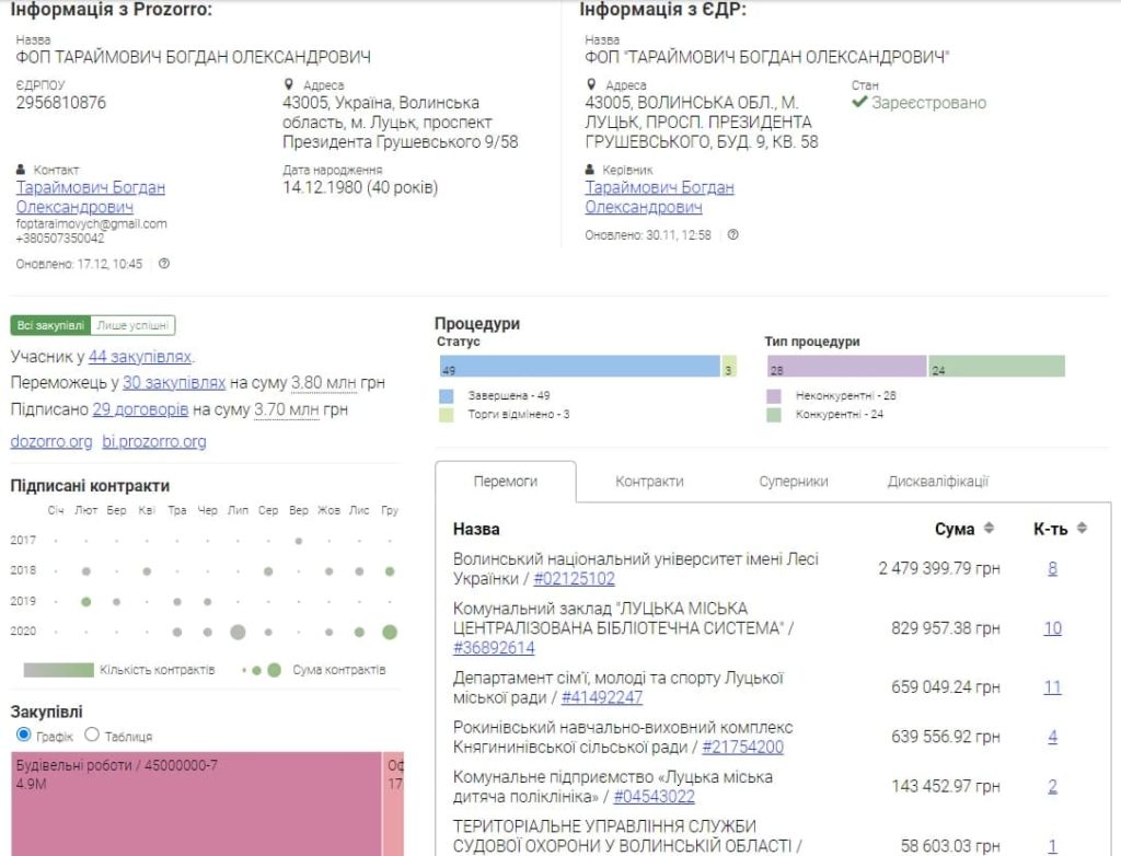 У всіх цих закупівлях переміг ФОП Тараймович. На два тендери подав пропозиції лише він сам, а по двох інших університет, в особі уповноваженої особи Юрія Білика, відхилив дві дешевші пропозиції фірми «К’ю Cтандарт». При цьому з протоколів не до кінця зрозуміло, через які невідповідності вимогам Замовника відхилили ці пропозиції. Ще в одній закупівлі підприємець Тараймович на аукціоні запропонував кращу ціну аніж ФОП Олександр Горбач.
