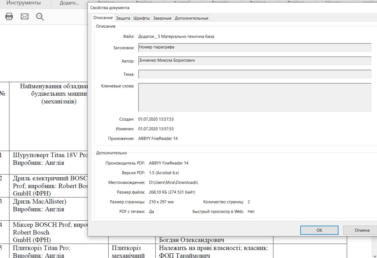 При ознайомленні з документацією замовника (ремонт гуртожитку, поточні ремонти, оголошені в листопаді) активісти ініціативи «За чесний тендер» помітили, що автором тендерної документації, згідно з властивостями файлу, є Зінченко Микола Борисович. Особа з таким же іменем є автором документів підприємця Тараймовича, що були подані на вказані закупівлі. Такі ж приклади ми знайшли і в документах Віктора Харчука. Тобто, або вони обоє переробляли свої пропозиції просто із завантаженої тендерної документації (що не дуже зручно), або ж документи замовника і учасника робила одна і та ж особа.