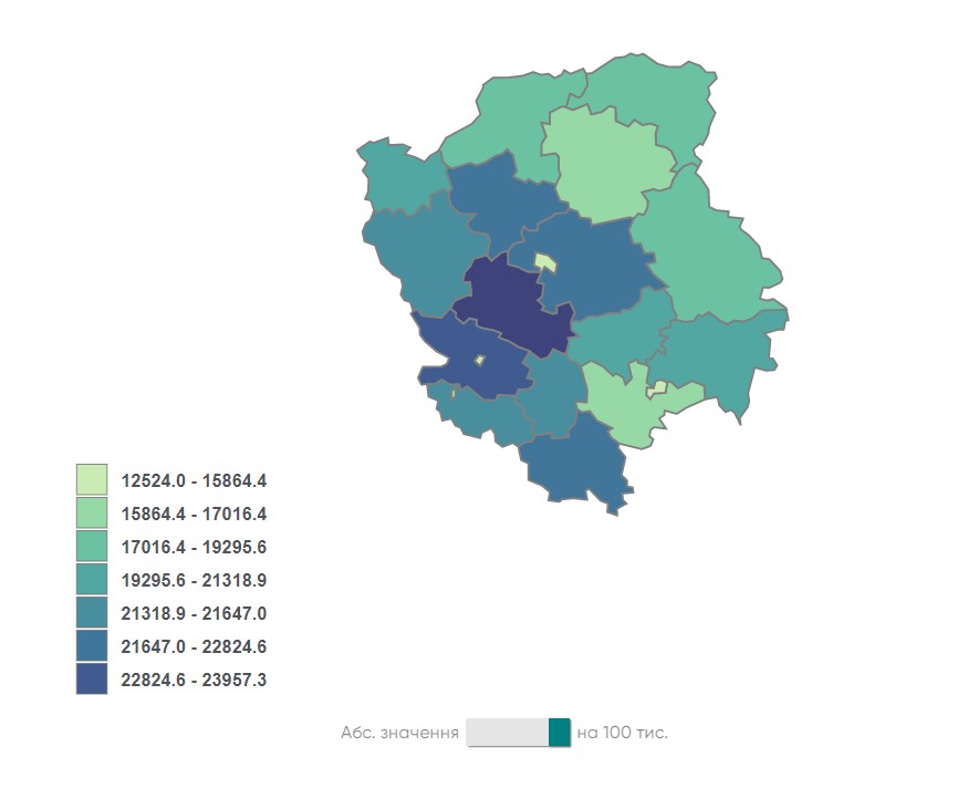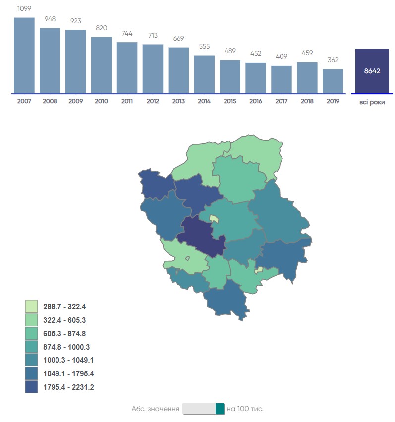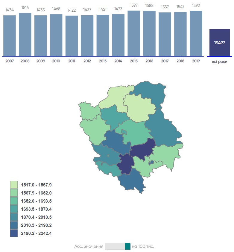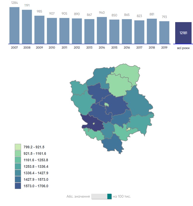 З допомогою інструменту у два кліки можна побачити статистику смертей від хвороб системи кровообігу та новоутворень, скільки людей померло від алкоголю в будь-якому з районів області, скільки років було цим людям, якої вони статі, де в регіоні відбувається найбільше вбивств та самогубств і в якому віці, скільки людей помирає від падінь, психічних розладів тощо.