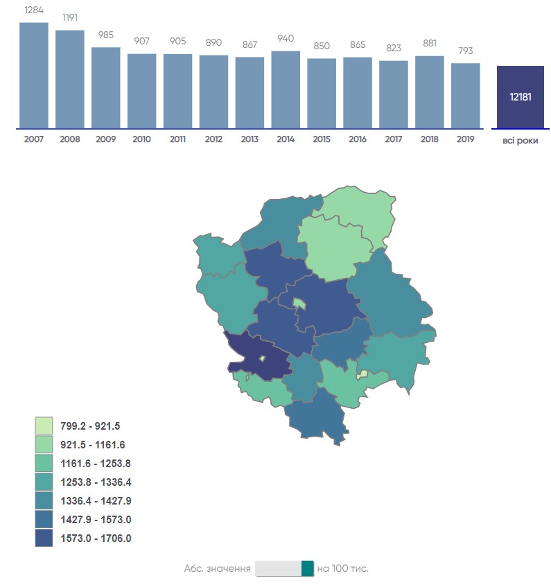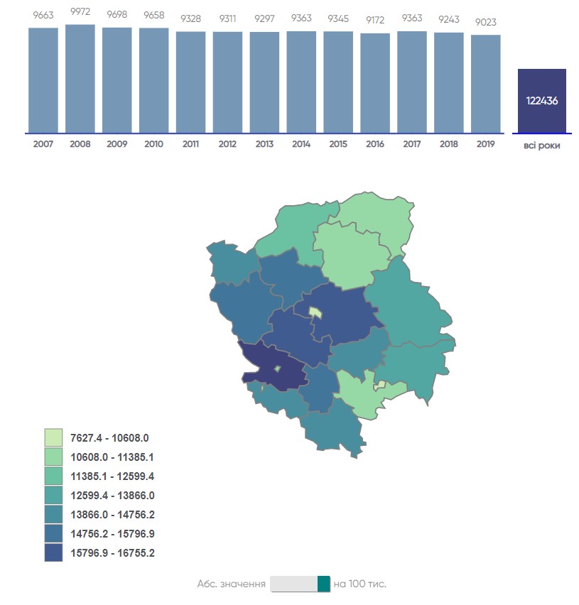 Щороку в області фіксують понад дев’ять тисяч смертей через хвороби системи кровообігу. Найбільше летальних випадків було у 2008 році – 9,9 тис. Найменше у 2019 році – 9,02 тис. смертей.