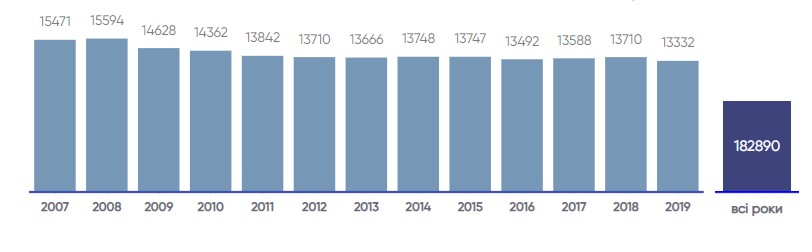 Найбільше смертей на Волині від новоутворень зафіксували у 2015 році – 1597 випадків. Трохи менше у 2019 році – 1592. Найменше смертей зафіксували у 2011 році, проте, і ця кількість не є низькою – 1,42 тис. випадки.