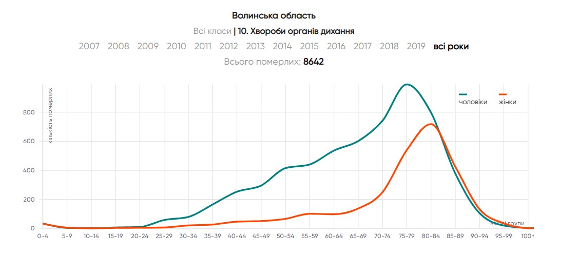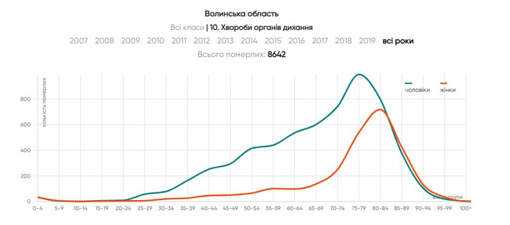 На Волині від хронічних хвороб нижніх дихальних шляхів понад 600 жінок померли у віці 80-84 роки. Більше 800-а чоловіків – у віці 75-79 років.