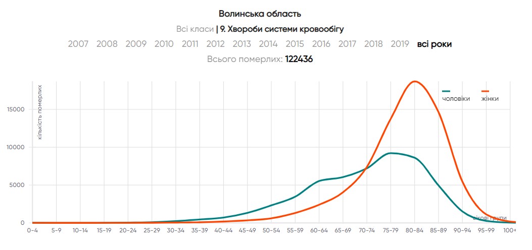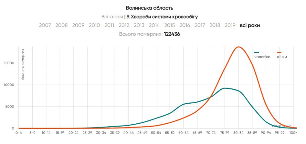 Згідно зі статистичними даними, найбільше людей померло від хвороб, що пов’язані з системою кровообігу – це, наприклад, атеросклеротична хвороба серця, цереброваскулярні хвороби, інфаркт головного мозку тощо. Загалом від такого роду недуг на Волині за 13 років померло більше 122,4 тис. людей.