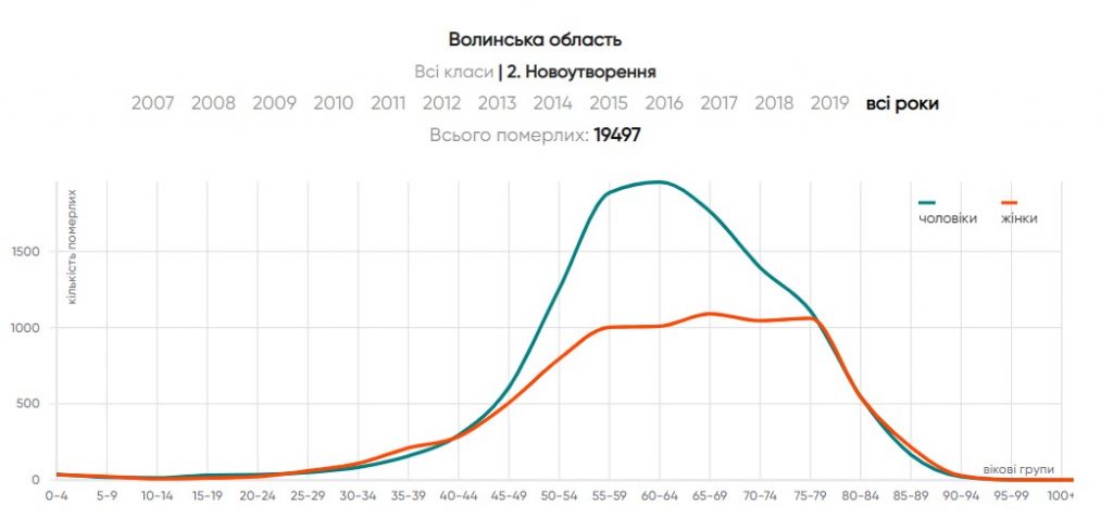 На Волині близько 2 тис. чоловіків померли від новоутворень у віці 55-64 роки. Ще одна тисяча жінок – у віці 55-64 роки, трохи більше однієї тисячі – у віці 65-79 років.