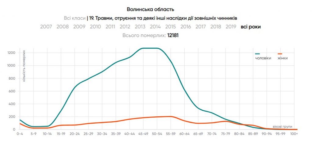Понад 12 тисяч волинян за 13 років померли від різного роду травм, отруєнь та дії певних зовнішніх чинників. Зокрема, найбільше летальних випадків викликали неуточнені травми та неуточнені зовнішні чинники, отруєння лікарськими засобами, медикаментами, токсична дія речовин, переважно немедичного призначення та травми голови.