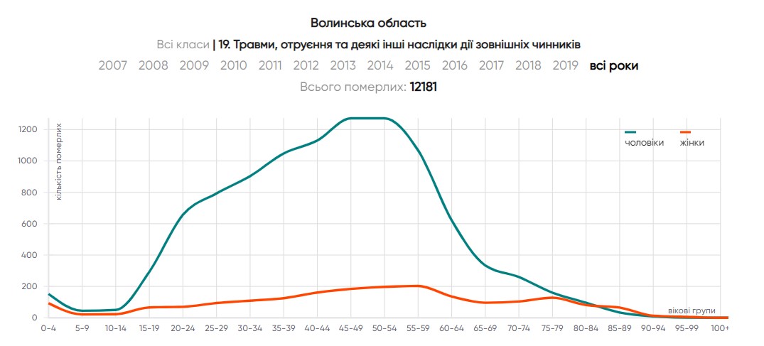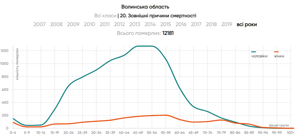 Найбільше смертей зафіксували у Луцьку – майже 1,72 тис. Серед померлих більшість – чоловіки (майже 1,38 тис.). Окрім того, через ці ж причини померла ще 341 жінка та 56 дітей. Загалом на Волині понад 1,2 тис. чоловіків померли у віці 45-54 роки. Ще 200 жінок – у 50-59 років.