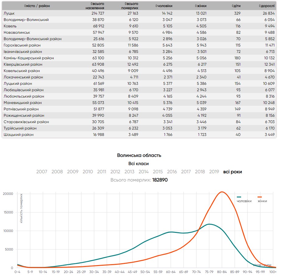 Також інструмент дозволяє перевірити, скільки людей померло від певної хвороби у тому чи іншому районі Волині. Окремо є інформація про кількість померлих за статтю та віком. Окрім того, інструмент містить статево-віковий аналіз померлих за кожною причиною.