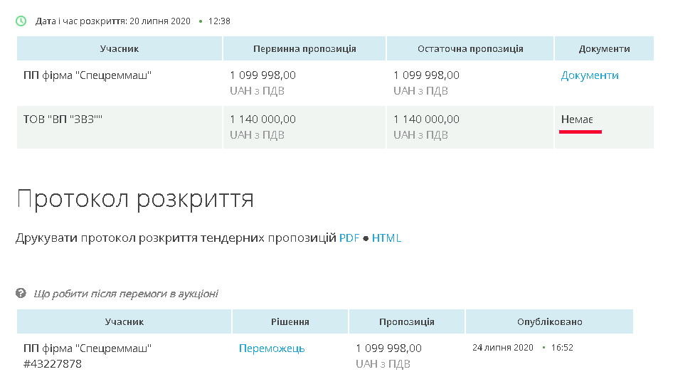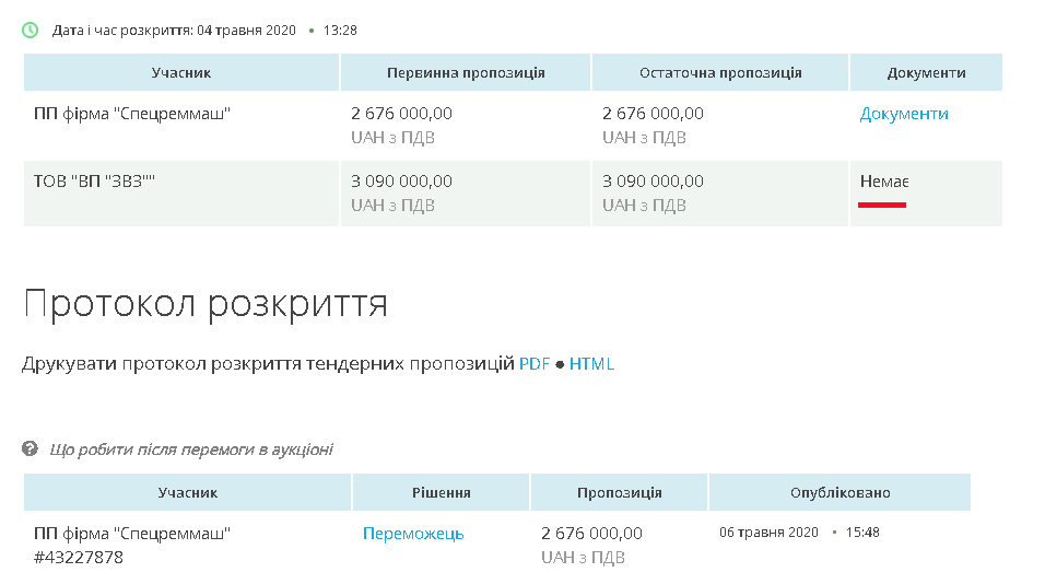 – Це відкриті торги. Система Prozorro сама визначає переможця, вони ж в аукціоні торгуються, – пояснює секретар тендерного комітету Ірина Топоровська. – І в них була нижча пропозиція, система визначила і ми дивимося документи. Документи всі були подані добре, відповідали нашій тендерній документації і ми їх визнаємо переможцем. Наступного учасника без потреби ми не розглядаємо.