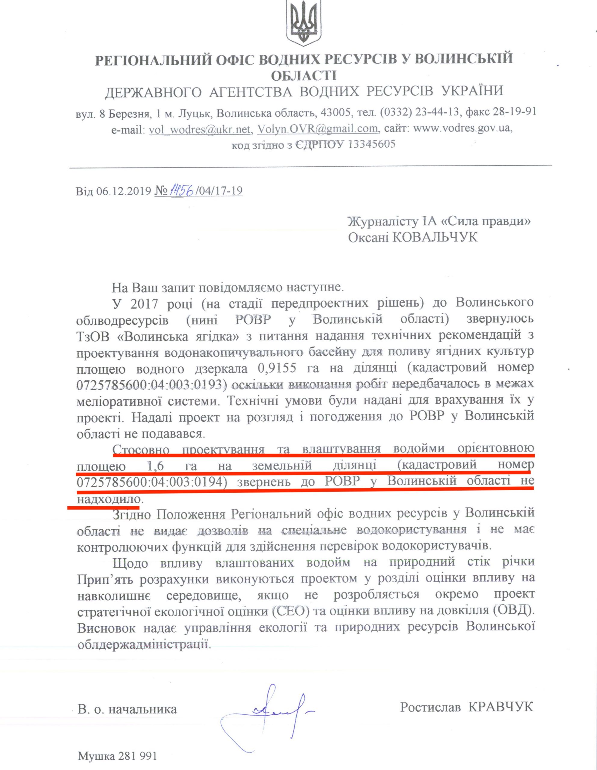 У секторі Державного агентства водних ресурсів у Волинській області кажуть, що «Волинська ягідка» дозволу на спеціальне водокористування не отримувала. Головний спеціаліст відомства Людмила Козлюк запевнила, що інші підприємства, які аналогічним чином збирають і використовують воду, роблять це на підставі таких дозволів.