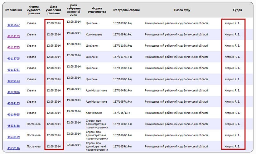 Видання «Антикор» проаналізувало судові рішення від 12 серпня 2014 року у справах під головуванням Руслана Хитрика. Отже, сама подія трапилась у робочий час, близько 14:30 12 серпня 2014 року. Цього ж дня суддя розглянув 12 справ і навіть притягнув іншого водія до відповідальності за керування транспортним засобом у стані сп’яніння. Зважаючи на те, що о 14-й годині суддя вже був «під мухою», можна уявити, яким чином він розглядав ці справи.