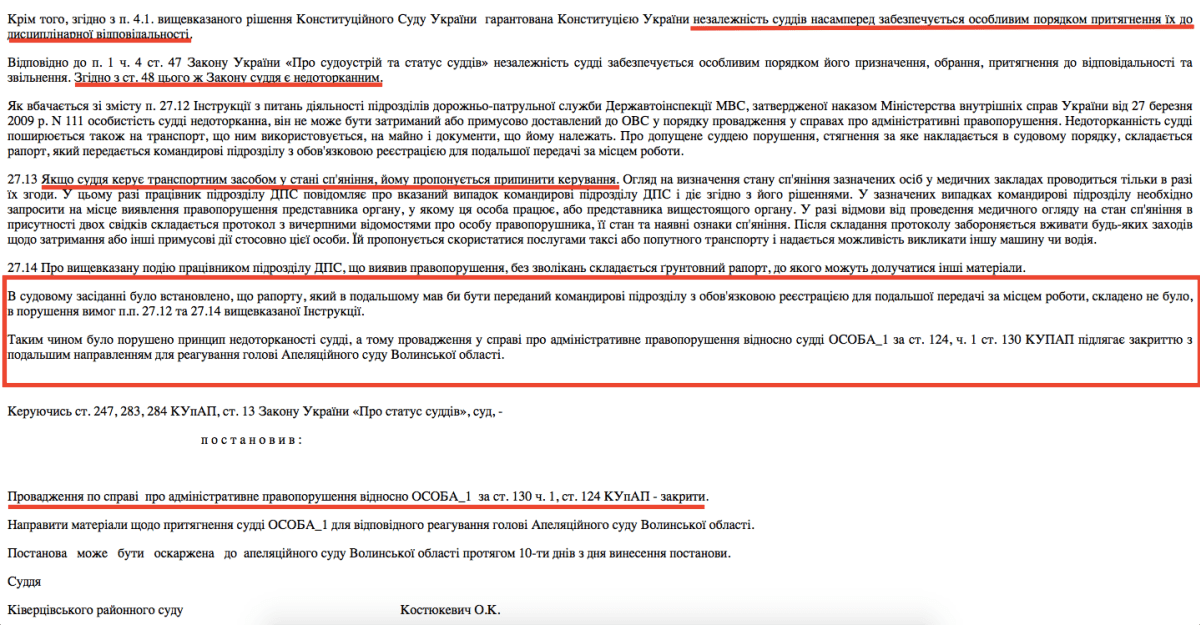 Прокуратура порушила кримінальне провадження щодо Руслана Хитрика, однак згодом справу перекваліфікували в адміністративне правопорушення. Проте судді вдалося уникнути навіть адміністративної відповідальності за керування автомобілем у нетверезому стані і не сплачувати штрафу. Ківерцівський районний суд в особі головуючого Олександра Костюкевича визнав незаконним складений протокол ДТП, оскільки, на думку правосуддя, він суперечив Закону України «Про судоустрій і статус суддів», яким суддя визнається недоторканим.