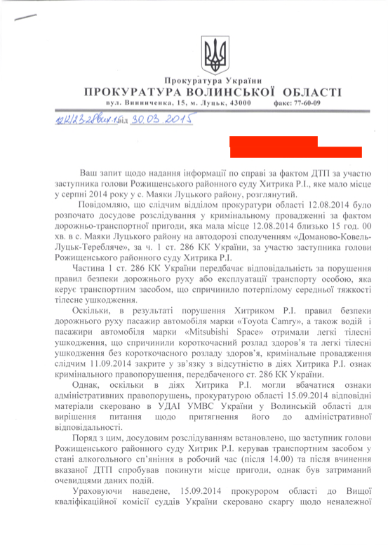 Невідомо, чи сприяли родинні зв’язки «вирішувати» проблеми, що почалися після ДТП. Однак у середу 30 травня на сайті Вищої кваліфікаційної комісії суддів України з’явилося повідомлення про те, що суддя Рожищенського районного суду Руслан Хитрик не відповідає займаній посаді.