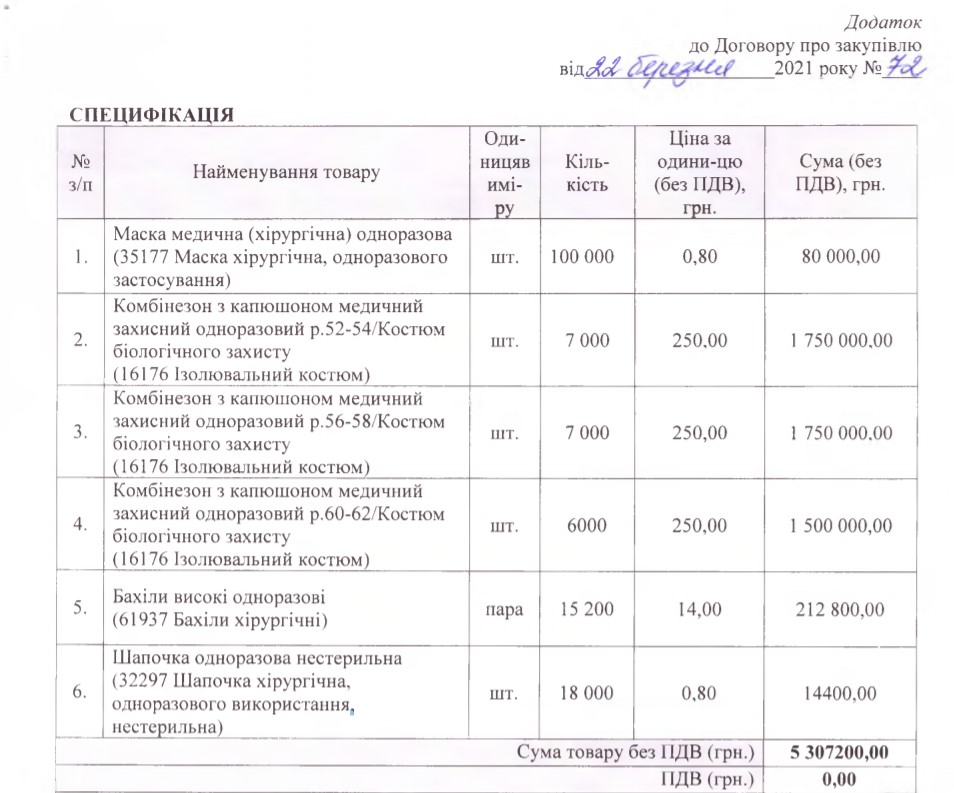 Лікарі «швидкої» замовили у ТОВ «Західна фармацевтична компанія» 100 тис. одноразових медичних (хірургічних) масок. За договором ціна за штуку склала 0,80 грн без ПДВ. Також придбали 20 тис. одноразових медичних захисних комбінезонів з капюшонами різних розмірів (52-54, 56-58, 60-62). Один такий обійшовся медикам у 250 грн без ПДВ.