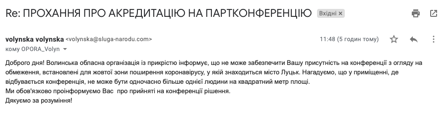 «Для акредитації на партійну конференцію «Слуги народу» у Луцьку потрібно було не пізніше як за добу до початку конференції подати заявку до Волинської обласної організації політичної партії «Слуга народу» шляхом надсилання на електронну пошту відомостей про прізвище, ім’я, посаду представника і назву ЗМІ. Ці відомості також можна було повідомити по телефону. Я надсилала заявку електронною поштою, щоб акредитувати на цей захід представника нашого видання «Точка Опори»», – повідомила координаторка Громадянської мережі ОПОРА у Волинській області Катерина Шарпата.