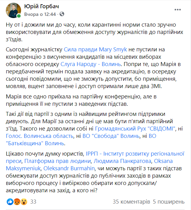 Ситуацію з недопуском журналістки на партійну конференцію прокоментував на своїй сторінці у Facebook директор Центру журналістських розслідувань «Сила правди» Юрій Горбач, зазначивши, що більше жодна з політичних партій, які провели свої конференції раніше, не забороняла журналістам вхід через карантинні норми.
