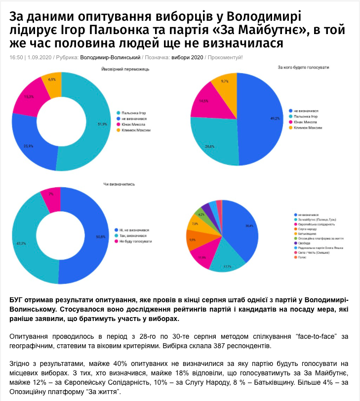 Зокрема, 1 вересня на сторінках інтернет-видання «БУГ» опублікували новину «За даними опитування виборців у Володимирі лідирує Ігор Пальонка та партія «За Майбутнє», в той же час половина людей ще не визначилася». Нагадаємо, Ігор Пальонка заявив, що балотуватиметься на посаду міського голови Володимира-Волинського від партії «За майбутнє».