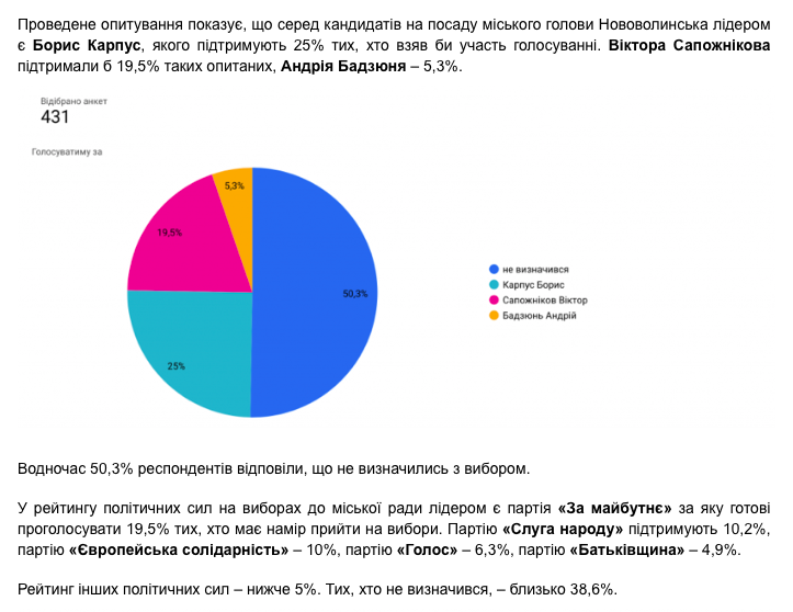 У тексті зазначалося, що видання отримало «результати одного соцопитування, яке проводили на початку серпня у Нововолинську представники однієї з громадських організацій». Натомість вказано мету опитування – з’ясувати рівень довіри до влади в місті та настроїв виборців напередодні місцевих виборів. Тут вказували, що анкетування проводилося в рамках всеукраїнського опитування: «Зміна влади: за крок до невідомого», однак немає інформації щодо його виконавця та замовника, а також відсутні формулювання питань, інформація про вибірку, час, методи, територію проведення дослідження.