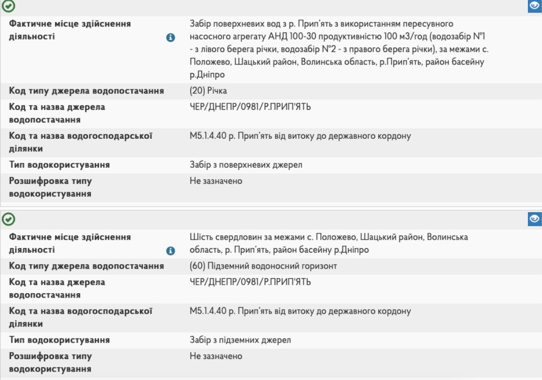 Окремо відзначу, що в дозволі на спецводокористування вказаний обсяг забору води в 289.959 м3 на добу. В той же час, згідно реєстру ОВД вказана належність планованої діяльності підприємства до пункту 3 частини 13 статті 3 Закону України «Про оцінку впливу на довкілля» (водозабір підземних вод, що перевищує 300 м3/добу). Враховуючи те, що це вказано окремо по кожній процедурі, обсяг забору води з свердловин планується як мінімум в 2 рази більший, ніж наявний в чинному дозволі на спецводокористування», — каже еколог.