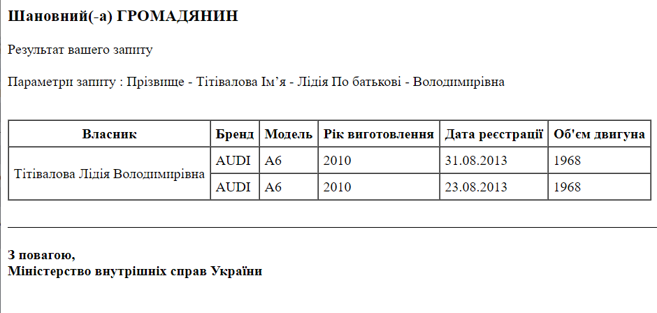 «Згідно висновку експертного дослідження № 166 від 23.12.2019 року, в заданій дорожній ситуації, з технічної точки зору, водій автомобіля «Ауді А6» Роман Тітівалов своїми однобічними діями не мав технічної можливості уникнути зіткнення з автомобілем ДАФ, з моменту виявлення небезпеки для руху шляхом застосування негайного гальмування. Зазначений висновок підтверджує неможливість з боку Романа Тітівалова уникнути ДТП»