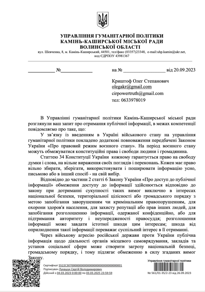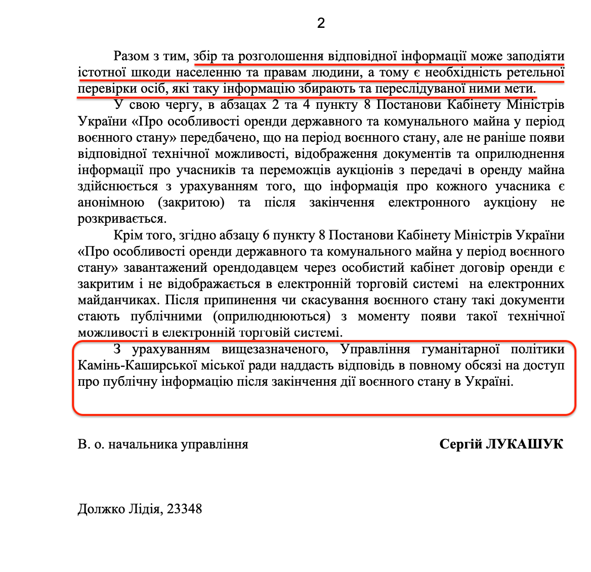 Щоправда, кількості таких договорів Сергій Лукашук назвати не зміг. А у відповідь на запит про надання публічної інформації з проханням показати копії договорів оренди, відповів, що на час дії воєнного стану публікація цих відомостей може загрожувати національній безпеці, а тих, хто її збирає треба ретельно перевірити.